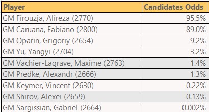 In ogni caso possiamo definitivamente dire che Caruana non è in forma smagliante. Pronostico: è molto difficile immaginare che possa piazzarsi tra i primi due posti.
