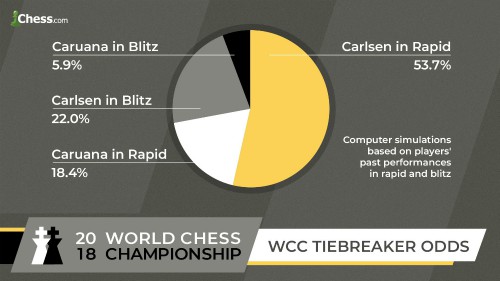 Carlsen ha il 75,7% di possibilità di vincere gli spareggi, che poi sostanzialmente è la percentuale che viene fuori dalla quote dei bookmakers, dai sondaggi tra gli appassionati e dai giudizi della maggioranza degli addetti ai lavori.
