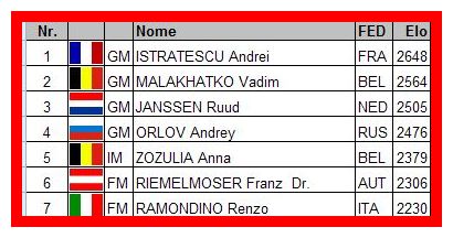 | Pos | Nr.s. | Nome | FED | Elo | Pts. | Cls1 | Cls2 | Cls3 | |