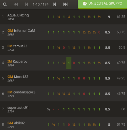 Tra gli Italiani, buona prestazione di Andrea Amato, 6,5 punti; si sono ben difesi anche Marchesich e Candian, per entrambi 6 su 9.