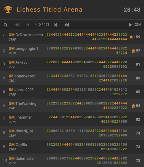 Thanks to GM DrDrunkenstein (Magnus Carlsen) for winning the second Titled Arena! 145 titled players played 3448 games!
