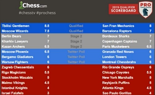 Match di “spareggio” contro Berlin Bears. Chi vince si qualifica per la Pro Chess League 2019. Qui si incontrano tutte le scacchiere tra di loro, per un totale di 16 partite. Cadenza più consistente: 7’+2″ contro i 3’+2″ della Fase 1.